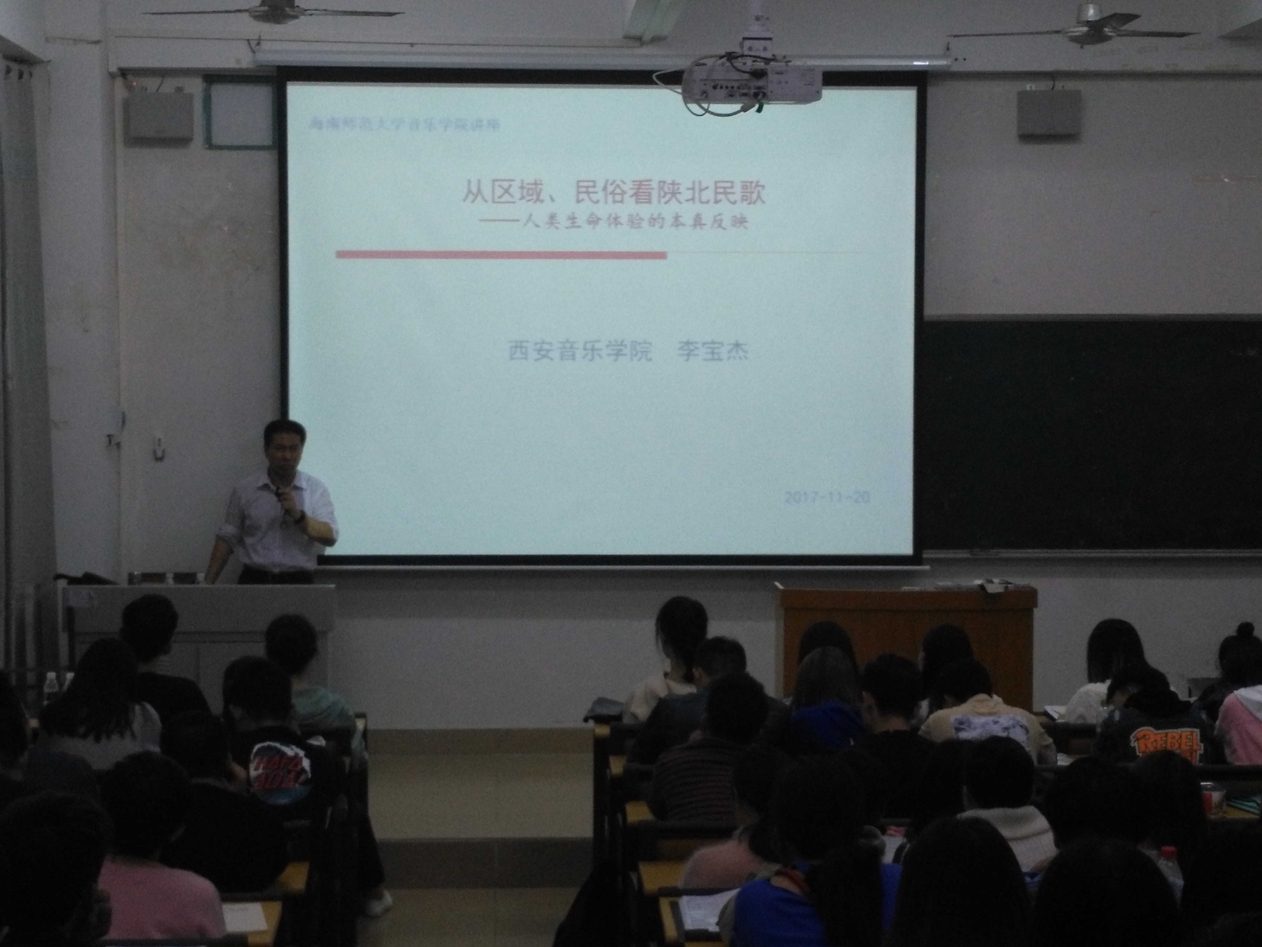 11月20日,西安音乐学院李宝杰教授应邀来我校讲学。活动在艺术楼101教室举行,音乐学院百余名师生聆听了这场以“从区域、民俗看陕北民歌——人类生命体验的本真反映”为主题的精彩的学术讲座。