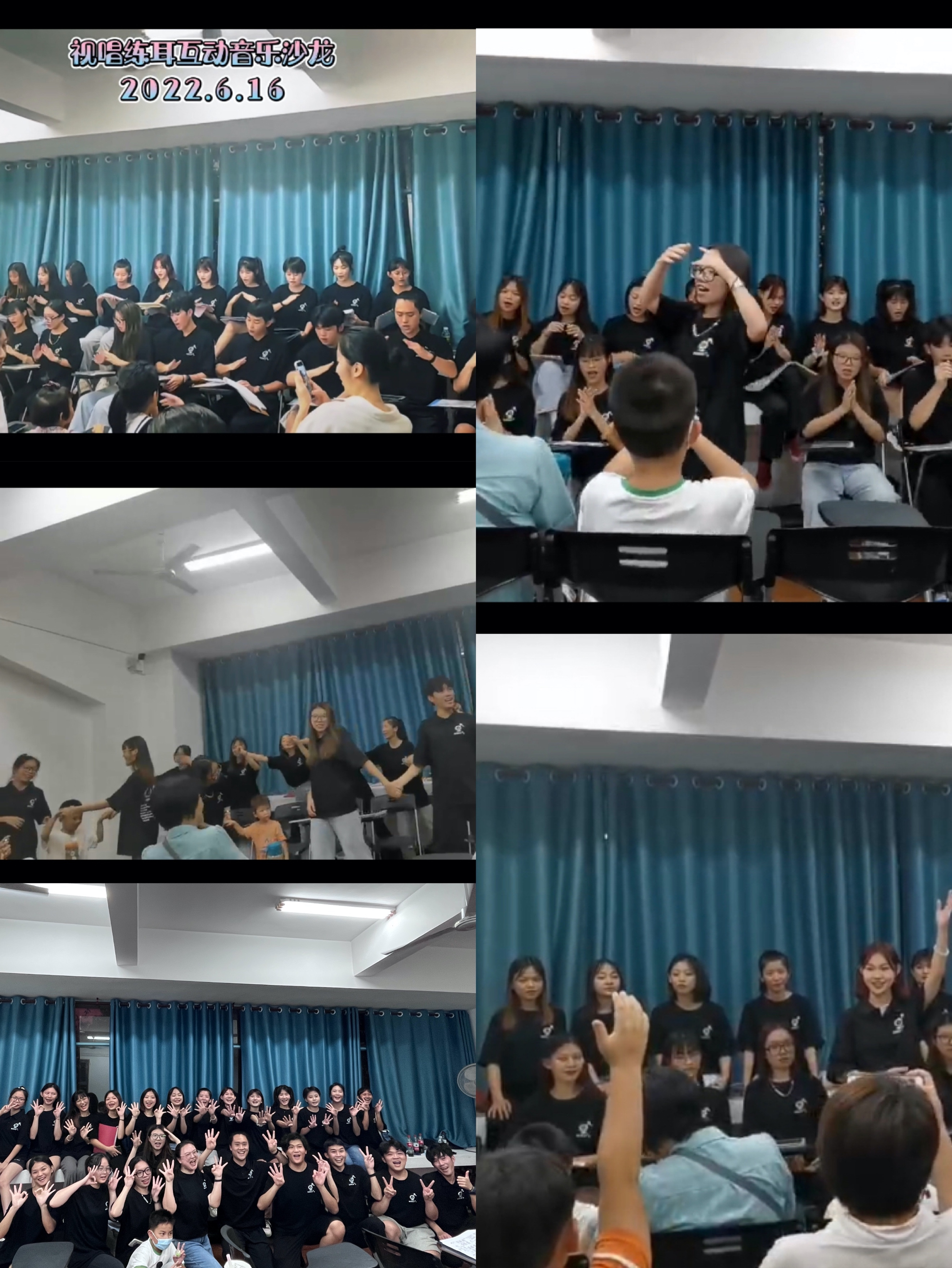 6月16日举办的“视唱练耳互动音乐沙龙”是我院青年教师张乐对于《视唱练耳》课程教学改革的一种探索和尝试,即将视唱练耳学习拓展为综合音乐能力的提升,同时鼓励学生将这种能力运用于实践。例如,通过固定调、首调和谱号转换的方式来唱五线谱作品;在简谱视唱中加入柯尔文手势、指挥图示,以及节奏声势,并带动现场观众进行双声部节奏演示; 以变换音节的方式来与观众进行互动式歌唱;以及,在歌唱的同时加入身体律动等。