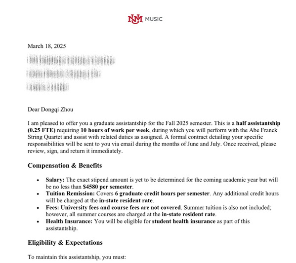 根据录取协议,周东奇同学就读期间将享受全额奖学金(学费全免)及额外颁发的2400美元助学金,用于支持学术研究与艺术实践。同时,她将担任该校驻团弦乐四重奏助教,每周完成10小时的演出排练、演出、教学辅助等工作,并获取相应薪资。此项资格充分展现其演奏技艺与教学潜力的双重优势,为职业发展构建国际化平台。