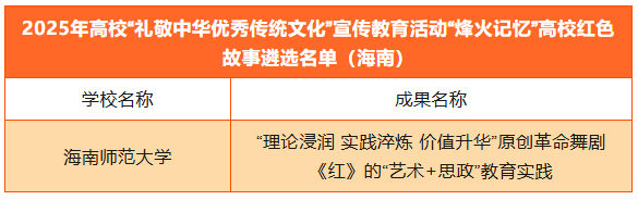 近日,教育部公布了2025年高校“礼敬中华优秀传统文化”宣传教育活动的结果.海南师范大学音乐学院张莹老师主导的《“理论浸润 实践淬炼 价值升华”原创革命舞剧〈红〉的“艺术 + 思政”教育实践》入选“烽火记忆”高校红色故事,此作品也是海南省在该系列中的唯一入选作品.
