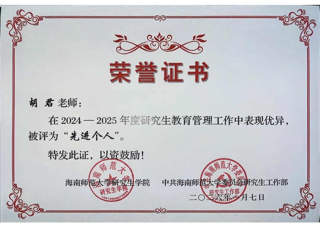 在研究生教育管理工作过程中,我院辅导员胡君老师凭借履职尽责的工作态度、成效显著的育人实绩,荣获“研究生教育管理工作先进个人”称号!