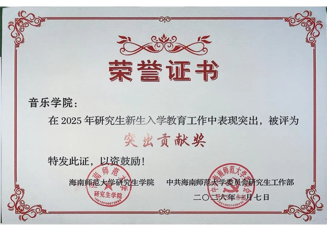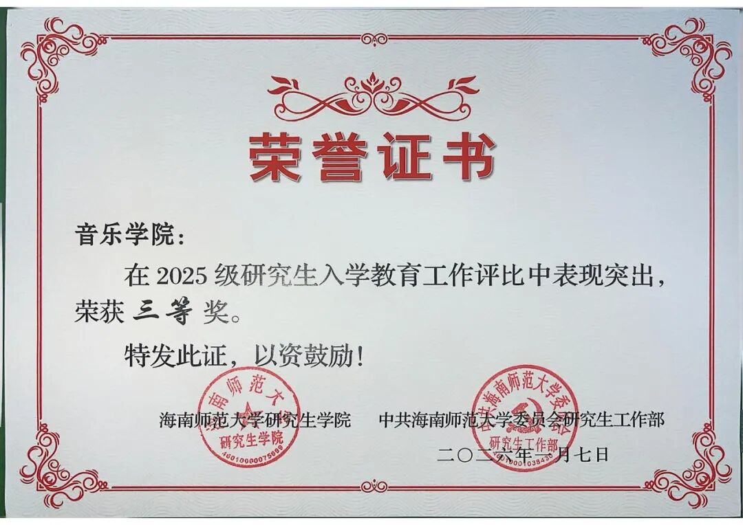 多项荣誉的背后,是音乐学院对研究生培养质量的极致追求,更是全体教育工作者深耕细作的育人成果。从特色鲜明的入学教育到常态化的成长陪伴,从集体荣誉的斩获到个人榜样的涌现,音乐学院始终以“立德树人”为根本,为研究生搭建起全方位的成长平台。未来,学院将以此次表彰为契机,珍惜荣誉、再接再厉,持续优化培养模式,强化特色育人优势,助力每一位研究生在学术探索中精进专业,在成长路上担当使命,为海南自贸港建设与艺术教育事业发展注入更多青春力量!